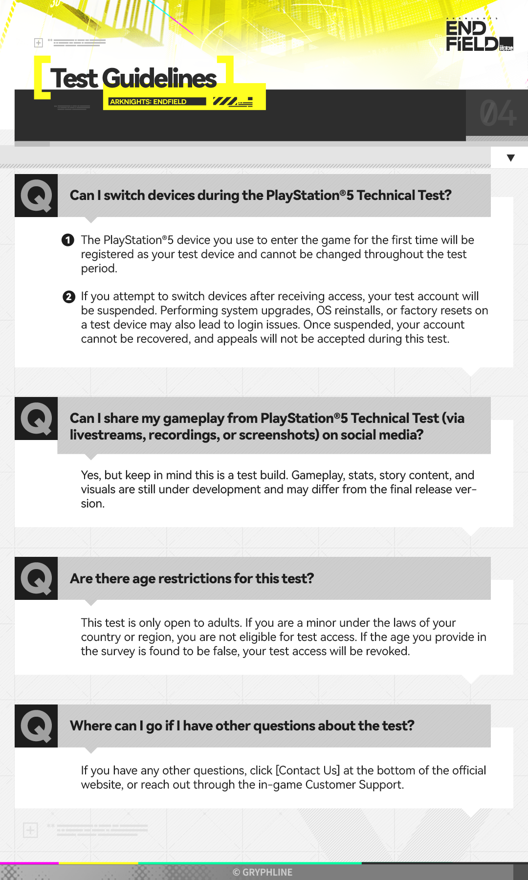 Recruitment for Arknights: Endfield PlayStation®5 Technical Test has officially started! Fill out the recruitment survey to apply for this round of testing. You'll find the key info and FAQs for this test below: