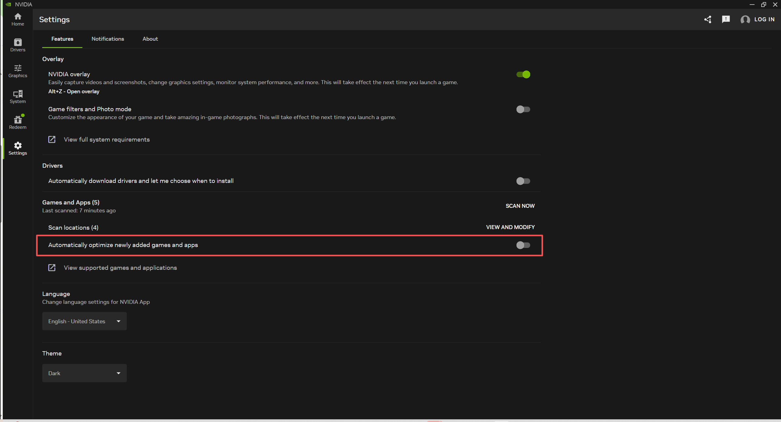 · Open NVIDIA App - Go to [Settings], find the [Automatically optimize newly added games and apps] option and turn it off.