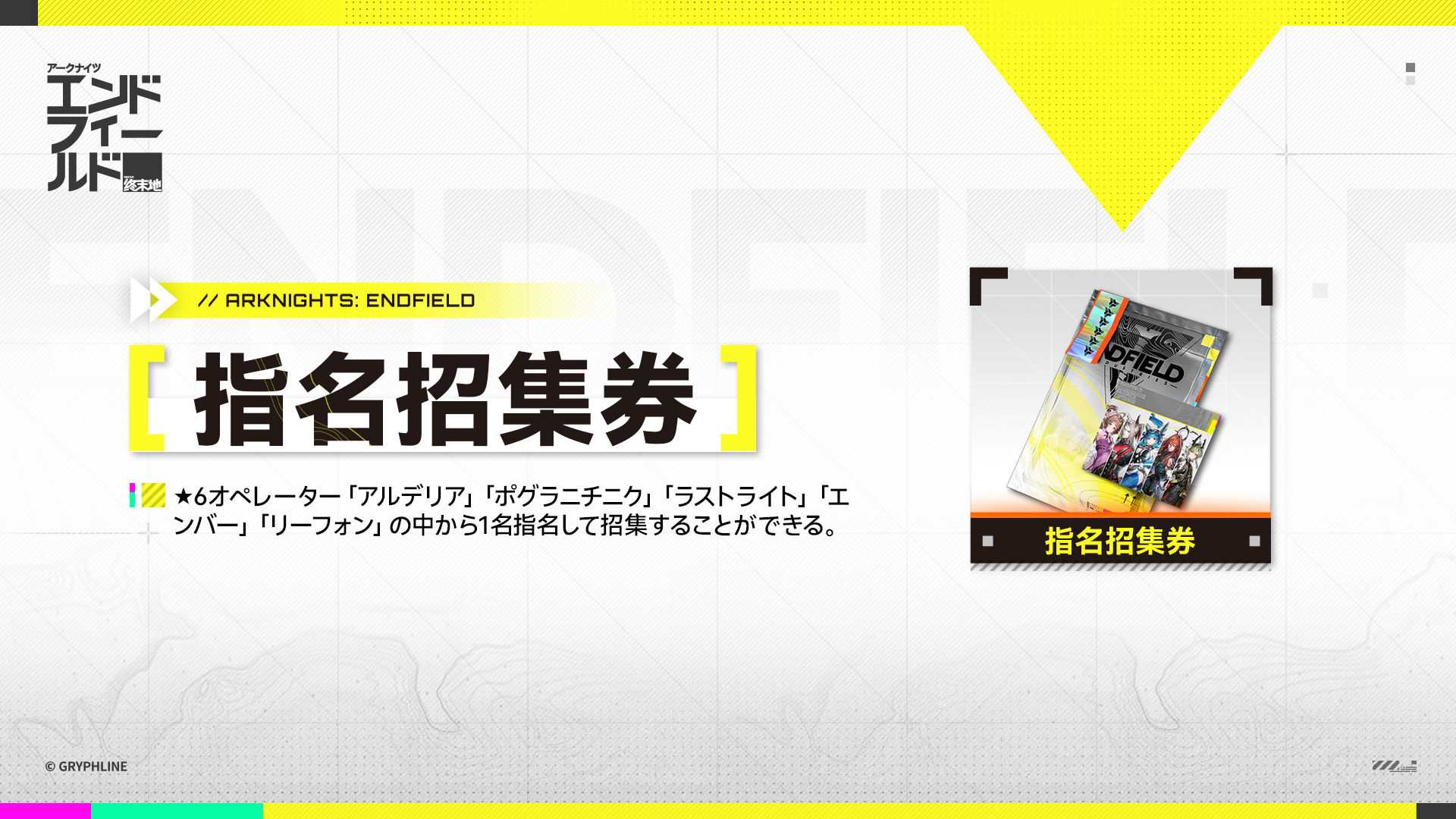 編成の難易度を下げ、序盤の戦闘や探索体験を向上させるために、メイン任務第一章プロセスⅠ「基地救援」を完了した時点で、【指名招集券】×1を追加で配布いたします。使用すると、通常スカウトで出現する★6オペレーターを1名指名して招集することができます。