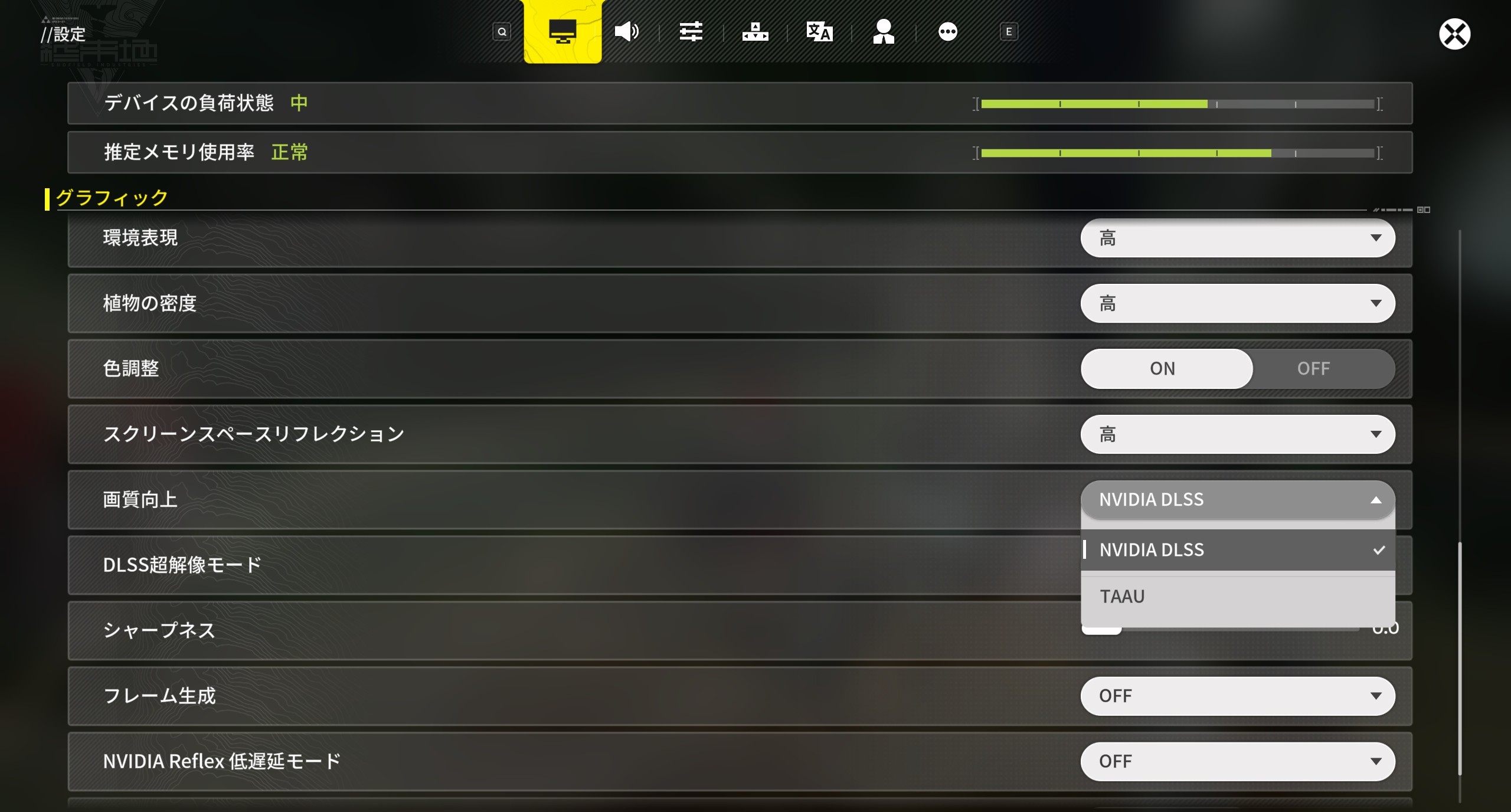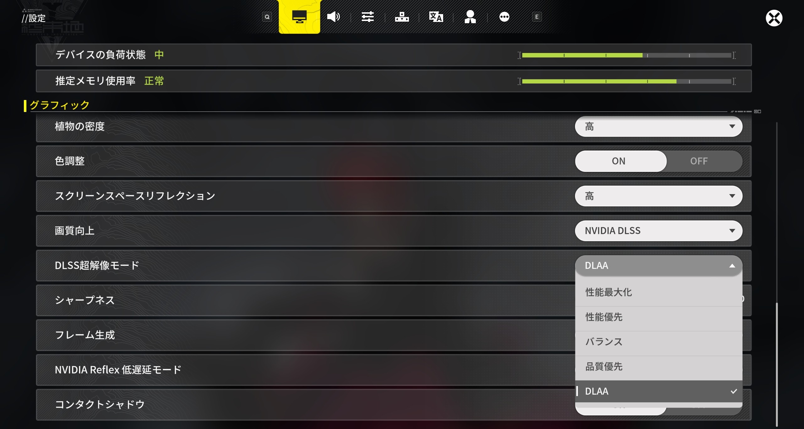 方法1:『アークナイツ:エンドフィールド』内 -【設定】-【グラフィック】-【画質向上】を開き、【NVIDIA DLSS】を選択、【DLSS超解像モード】を現在のデバイス負荷に適したオプションに調整します。