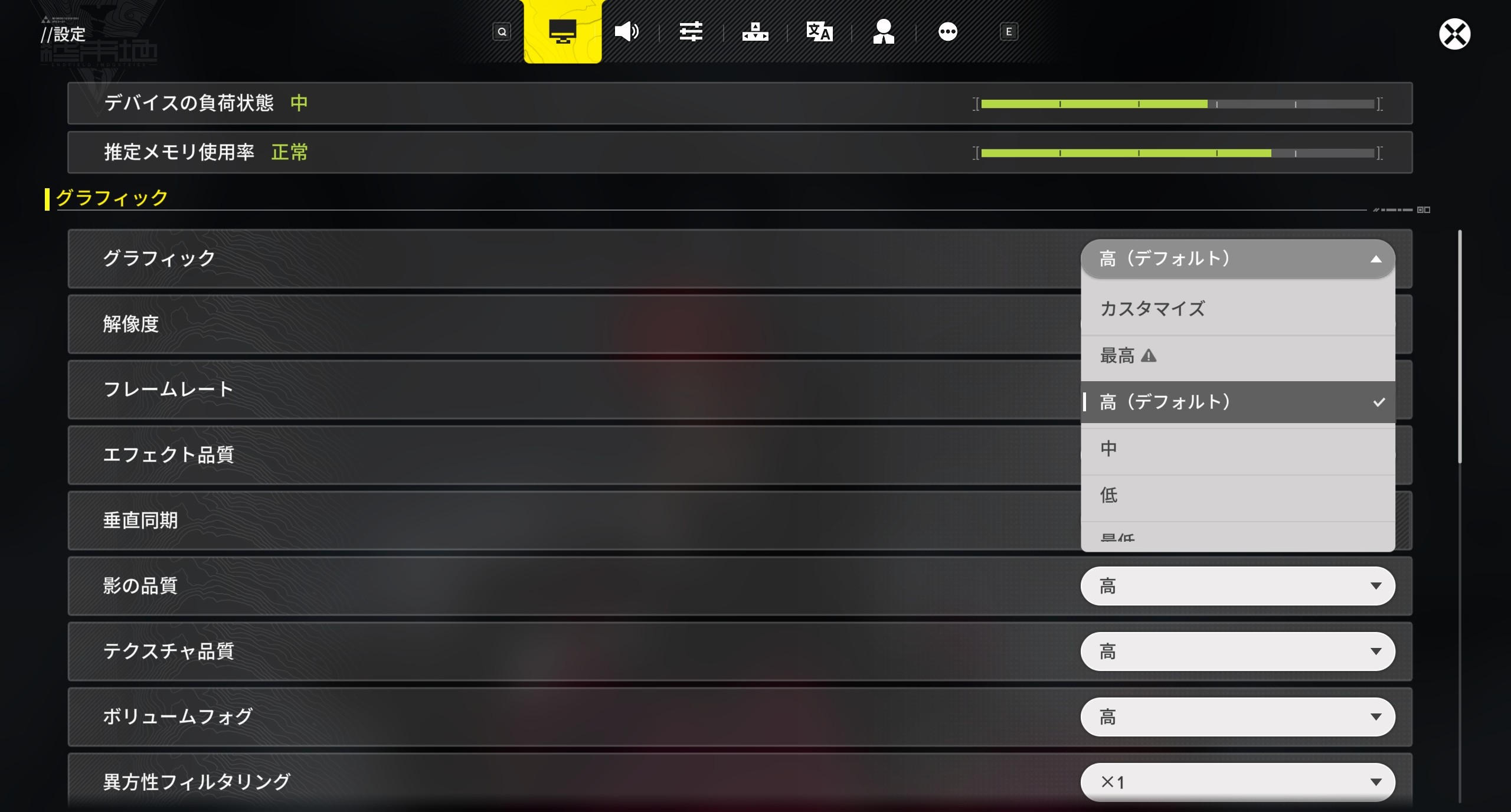2. 【グラフィック】を現在のデバイス負荷に適したオプションに調整します。