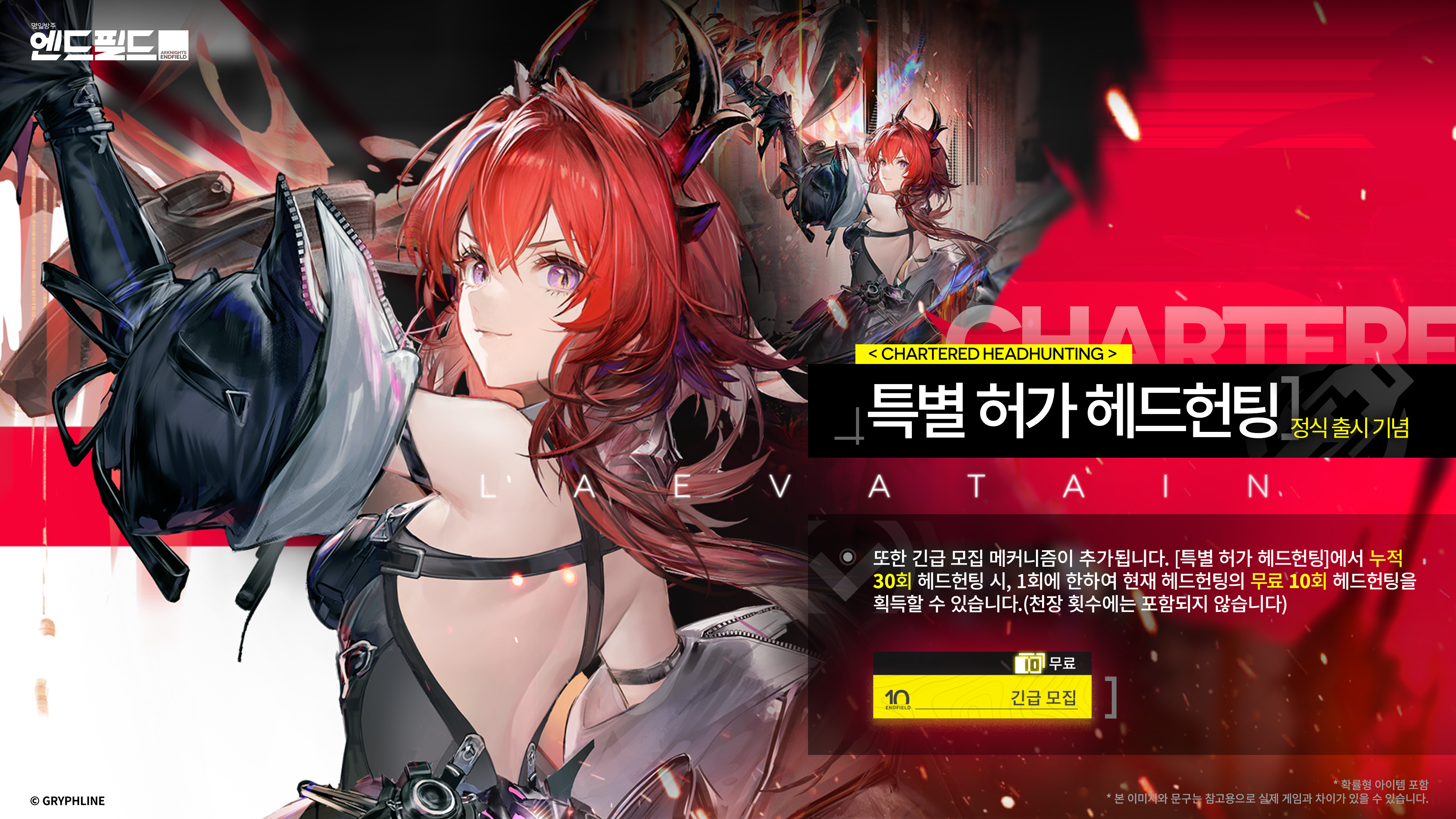 · 「긴급 모집」 메커니즘 신규 추가: 「특별 허가 헤드헌팅」에 「긴급 모집」 메커니즘을 추가했습니다. 누적 30회 헤드헌팅 시 추가로 10회 긴급 모집(즉, 1회 무료 10연속 헤드헌팅)을 획득합니다. 긴급 모집의 오퍼레이터 획득 확률은 「특별 허가 헤드헌팅」의 기본 확률과 동일하며, 추가로 지급되는 10연속 헤드헌팅은 천장을 통해 반드시 5성 이상의 오퍼레이터를 획득할 수 있습니다. 해당 결과는 「특별 허가 헤드헌팅」의 천장 횟수에 집계되지 않으며, 「특별 허가 헤드헌팅」 보상 획득에 필요한 누적 헤드헌팅 횟수에도 포함되지 않습니다.