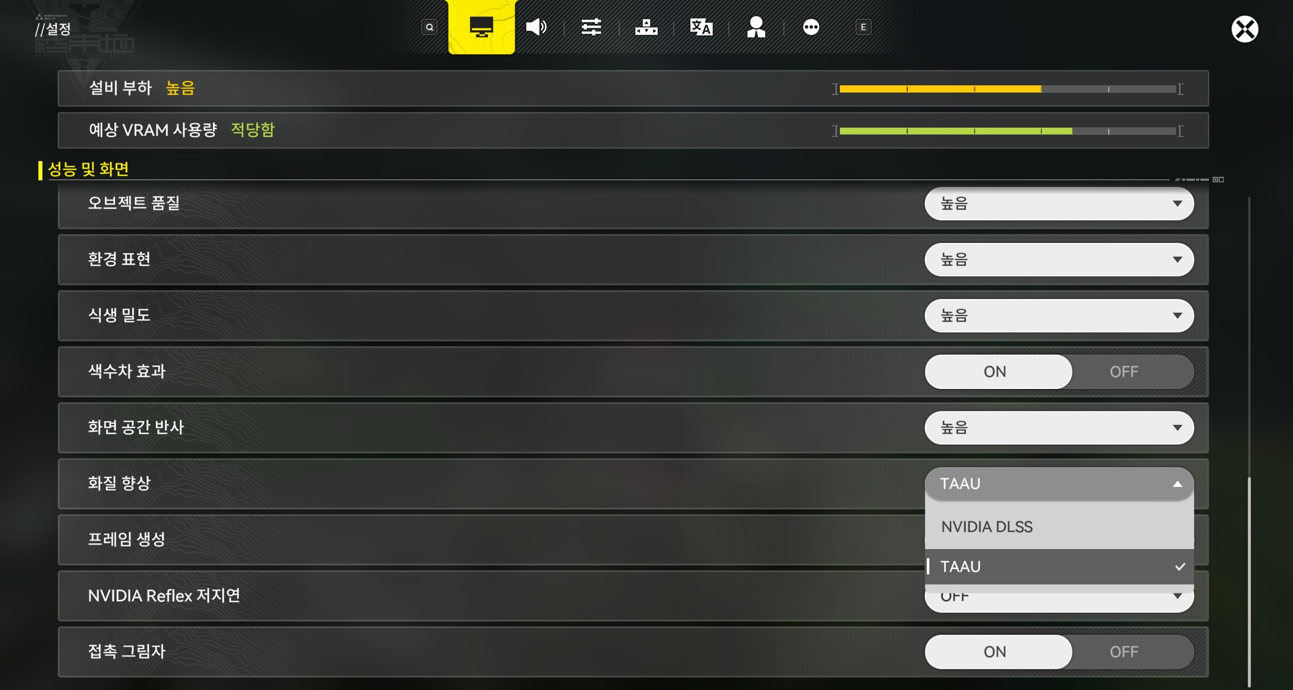 방법 2: 「명일방주: 엔드필드」 내 - [설정] - [성능 및 화면] - [화질 향상]에서 옵션을 [TAAU]로 조정한 후, [렌더링 스케일] 옵션을 통해 화질을 조정합니다.