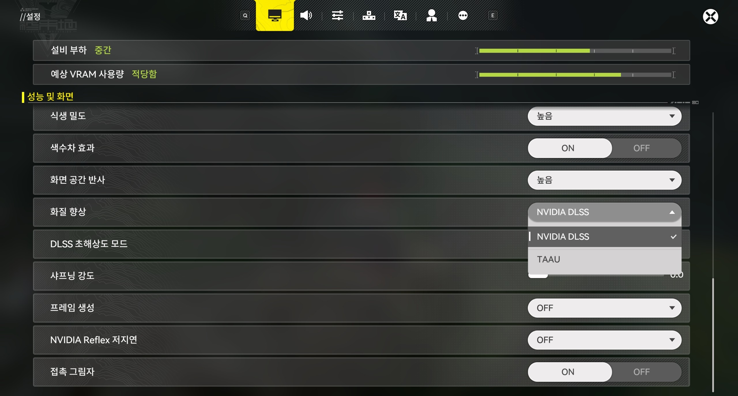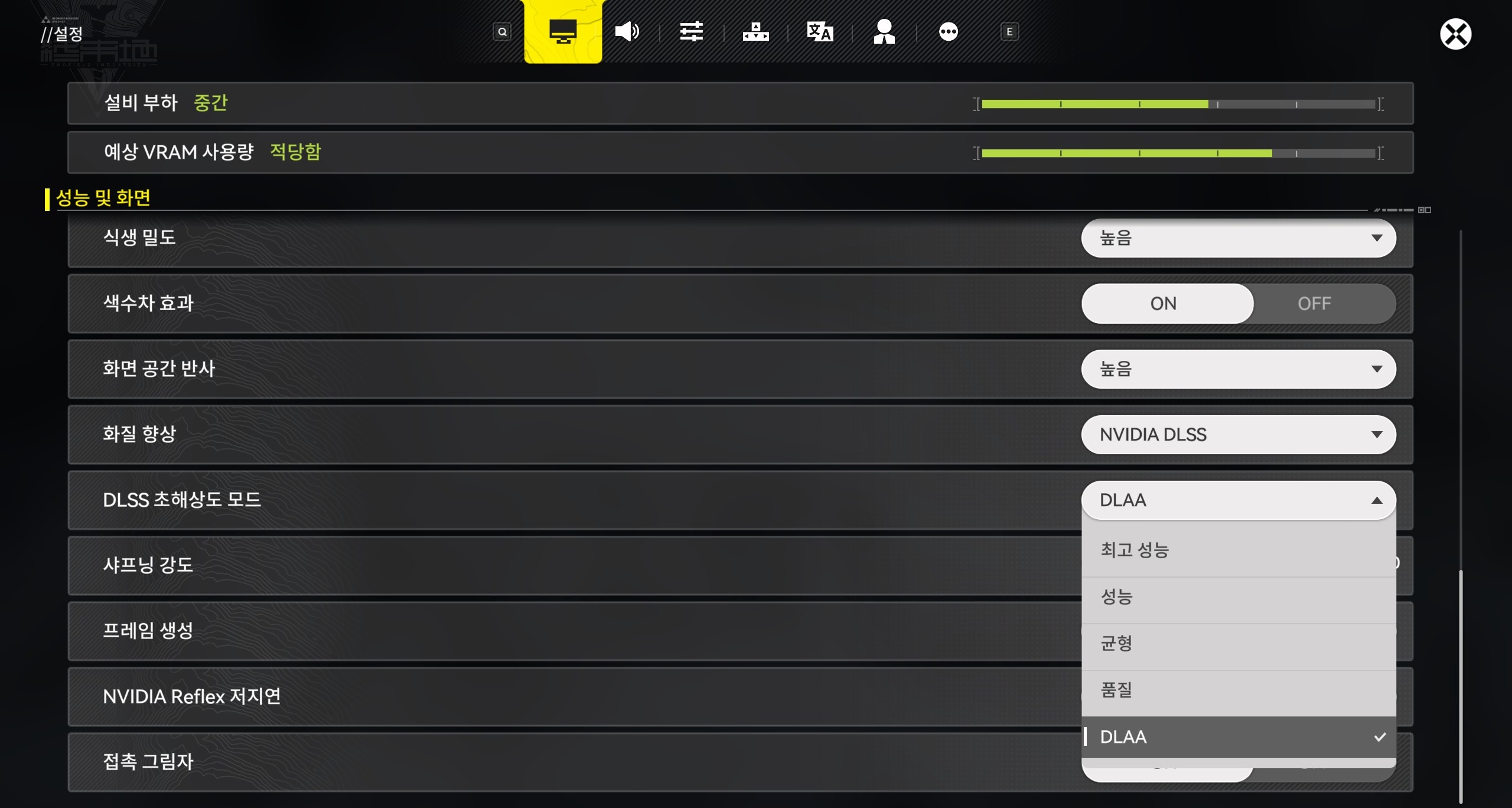 방법 1: 「명일방주: 엔드필드」 내 - [설정] - [성능 및 화면] - [화질 향상]에서 [NVIDIA DLSS]를 선택하고, [DLSS 초해상도 모드]를 현재 디바이스 부하에 적합한 옵션으로 조정합니다.