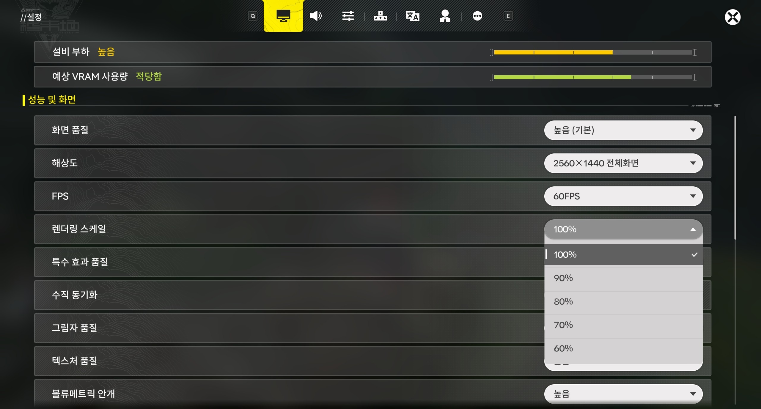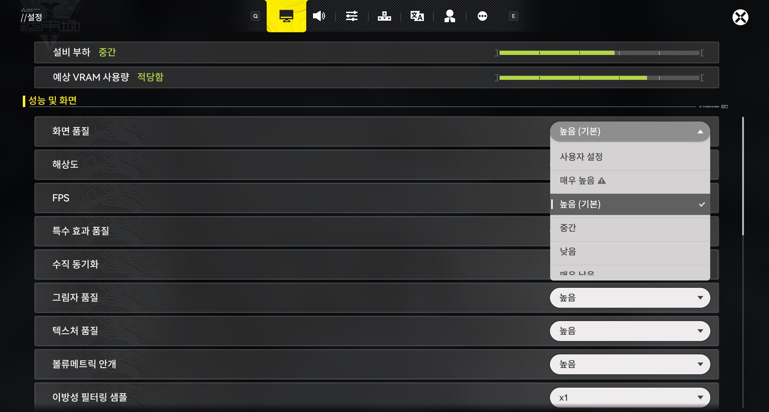 1. 「명일방주: 엔드필드」 내 - [설정] - [성능 및 화면] - [화면 품질]을 엽니다.