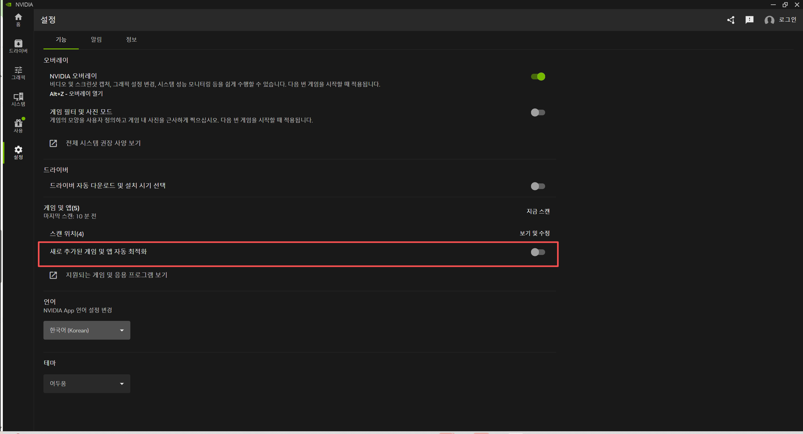 · NVIDIA App 열기 - [설정]을 열고, [새로 추가된 게임 및 앱 자동 최적화] 옵션을 찾아 끕니다.