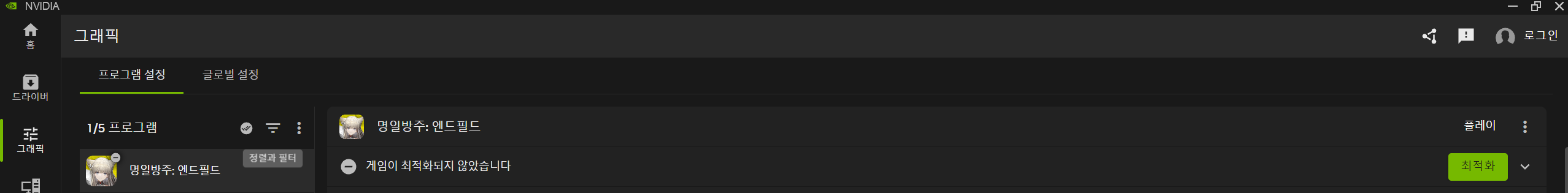 · NVIDIA App 열기 - [그래픽] - [프로그램 설정] - 「명일방주: 엔드필드」 선택