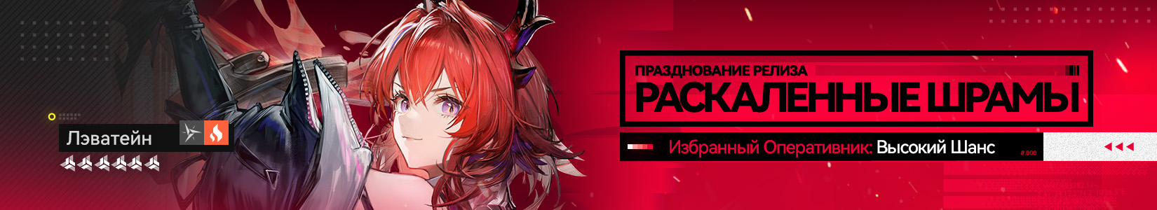 · В ходе специального найма «Раскалённые шрамы» доступны следующие шестизвёздные оперативники: Лэватейн, Гилберта, Ивонна, Эмбер, Лифэн, Арделия, Панихида и Пограничник.