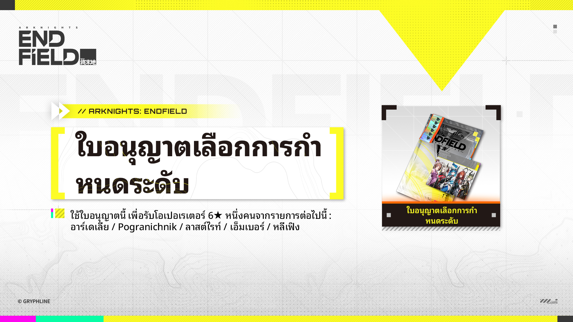 vเพื่อทำให้การสร้างทีมสำหรับ Endministrators ง่ายขึ้น และปรับปรุงประสบการณ์การต่อสู้และการสำรวจในช่วงต้นเกม Endministrators ทุกคนที่ทำภารกิจหลัก [บทที่ 1 องก์ 1: ฝ่าวงล้อม] สำเร็จ จะได้รับรางวัลความคืบหน้า [ใบอนุญาตเลือกการกำหนดระดับ]×1 ใช้ใบอนุญาตนี้เพื่อเลือกตัวที่ต้องการและรับหนึ่งในโอเปอเรเตอร์ 6★ ที่อยู่ในแบนเนอร์การสรรหาขั้นพื้นฐาน
