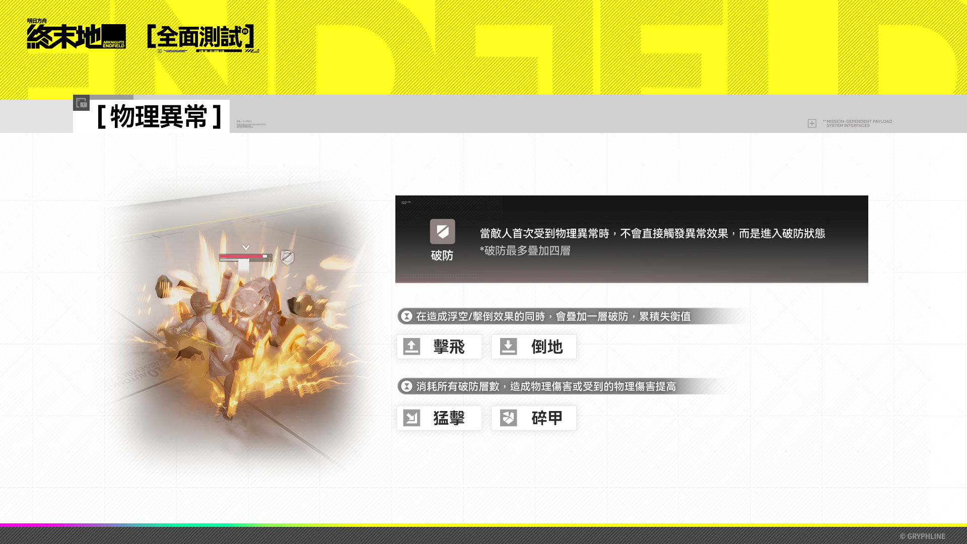 物理異常:新增「破防」層數機制(最多可疊加4層)。「擊飛」和「倒地」效果可以疊加「破防」層數;「猛擊」和「碎甲」效果可以消耗「破防」層數,並觸發不同的強力效果。